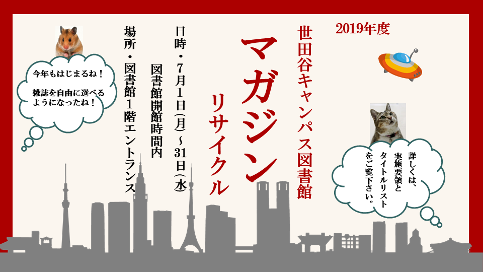 世田谷キャンパス図書館では次の日程でマガジンリサイクルを実施します。 マガジンリサイクルは利用者サービスの一環として保存期間が終了となった雑誌を希望する学内の皆さんへ差し上げる企画です。実施日時:2019年7月1日(月)~31日(水) 図書館開館時間内場所:世田谷キャンパス図書館1階 エントランスリサイクル対象の雑誌タイトルはこちら