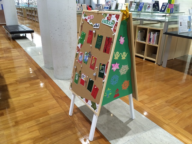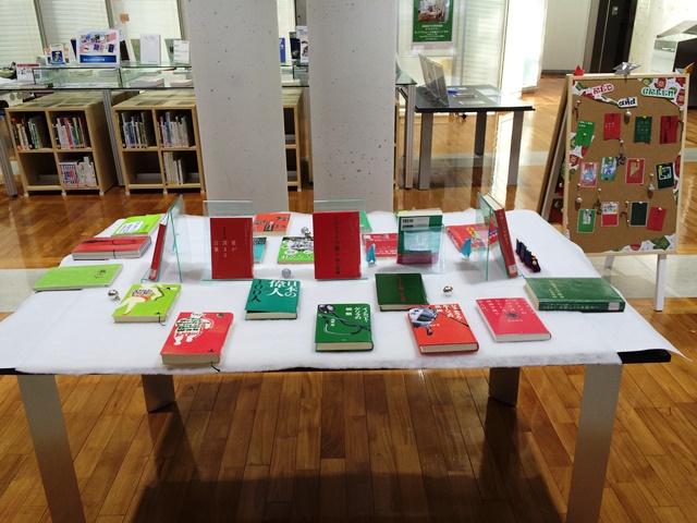 一覧へ 【終了しました】SC展示『RED and GREEN』 実施中 投稿日時: 2014/12/09 世田谷 現在、世田谷キャンパス図書館ではクリスマスをイメージする赤と緑色の図書を展示した『RED and GREEN』 を実施しています。クリスマスツリーに装飾したイーゼルがコーナーを案内。雪をイメージした展示台に本が並べられています。 展示中の図書は貸出も可能です。どうぞご覧ください。