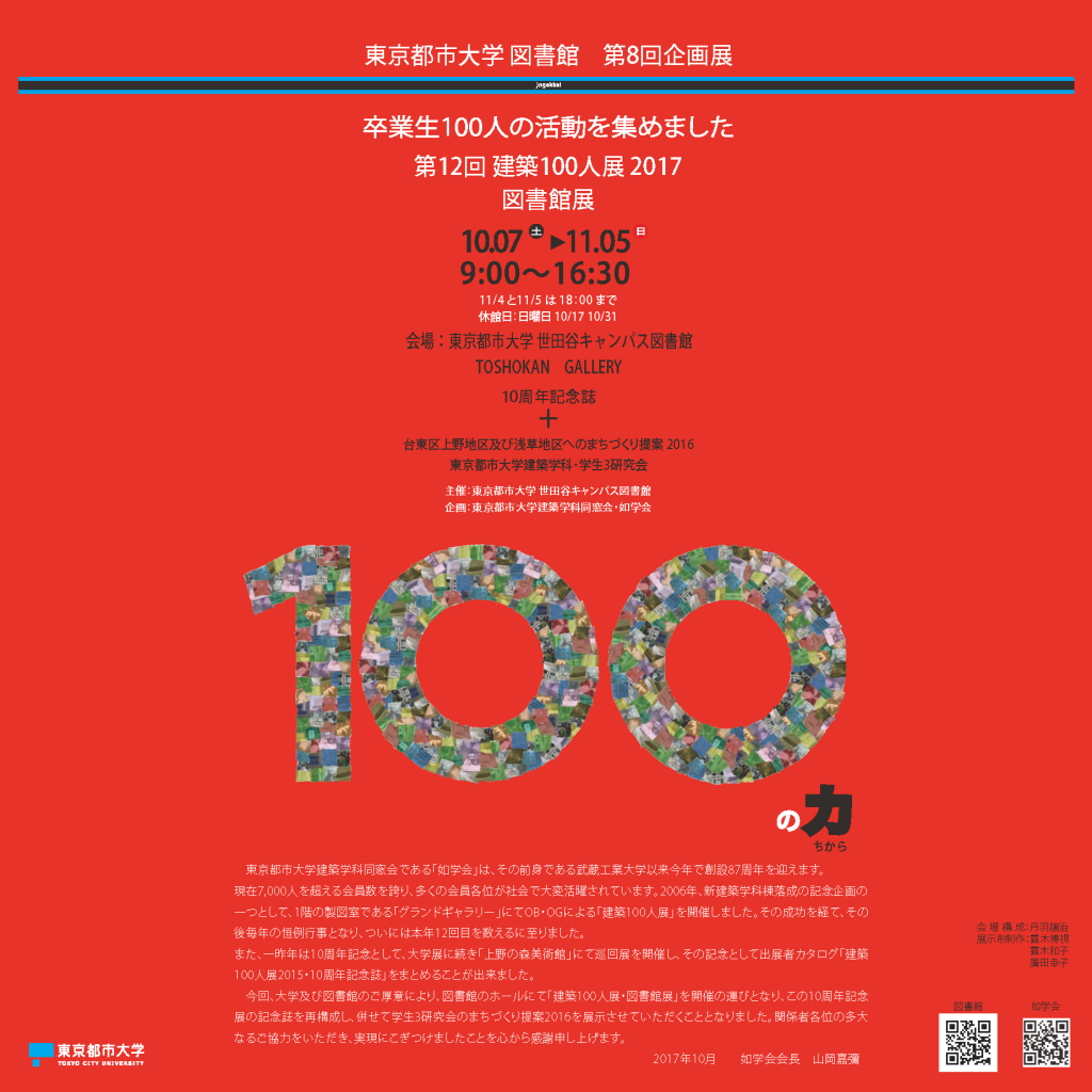 本展覧会は東京都市大学建築学科同窓会である「如学会」が企画し、建築学科卒業生100人の活動を紹介するものです。