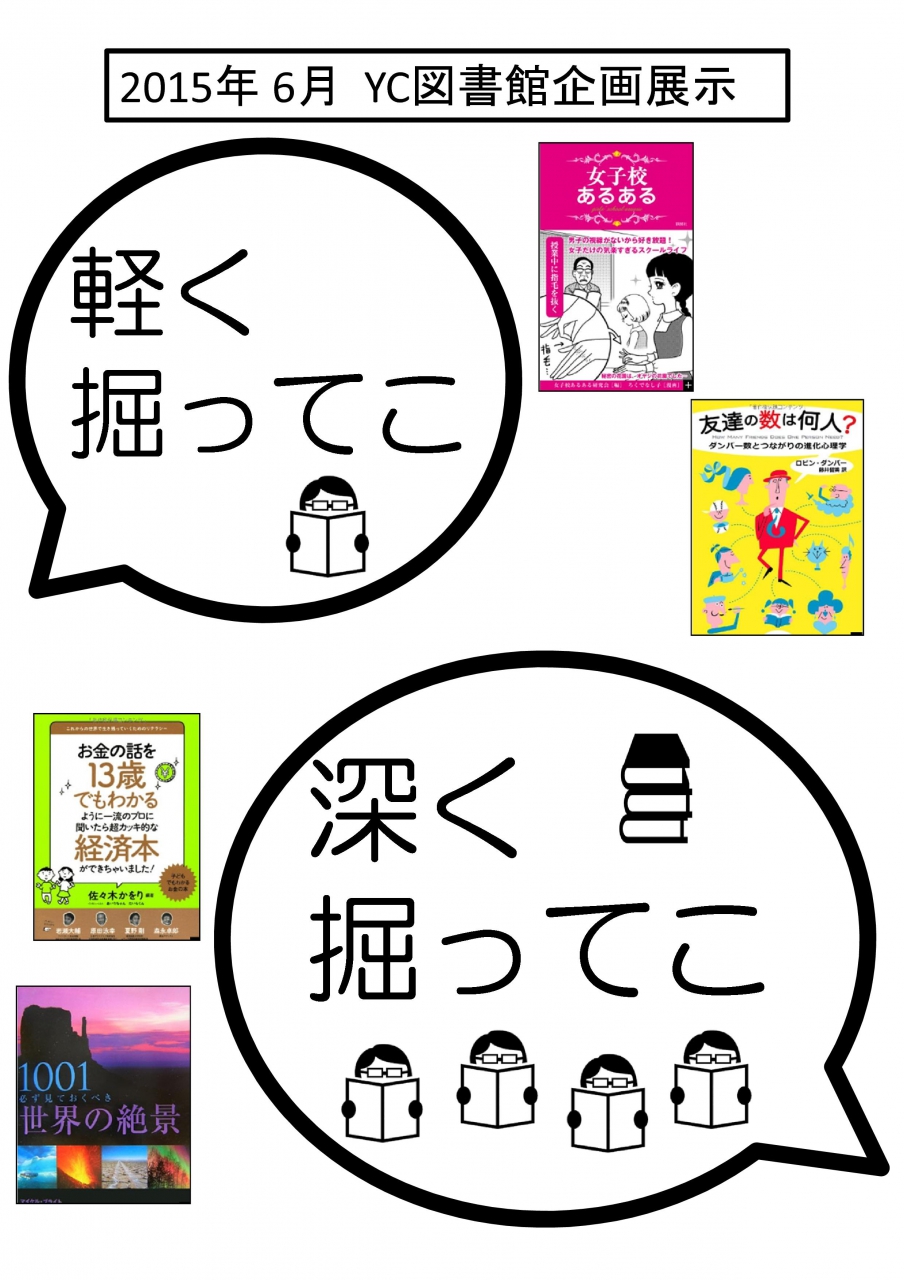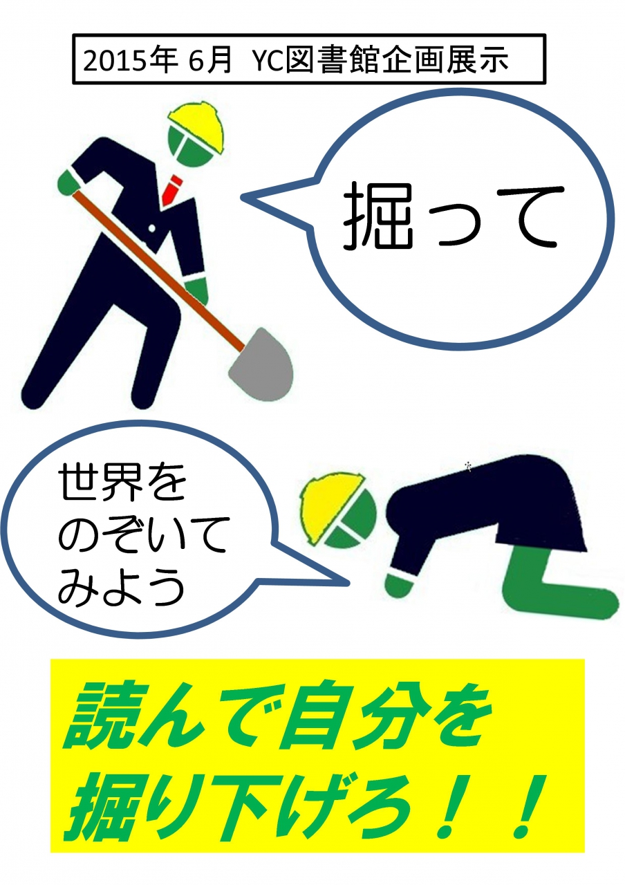 一覧へ 【終了しました】YC企画展示2015第4弾「掘ってく?」やってます 投稿日時: 2015/06/06 横浜 横浜キャンパス図書館では、企画展示 「掘ってく?」をやっています。 ”読んで色んな世界をのぞいて、浅く広く、深く深く、掘って掘って掘り下げてみよう!” ・・・そんな感じです。 図書館に 寄ってこ読んでこ 掘ってこー 他キャンパスの皆さんもどうぞご利用ください。 【展示の様子】 ※画像をクリックすると拡大します。 <今回のテーマは ↑ > <掘るって?> <アルバイトの皆さんが作ったダンボール本棚> (関連ページ) ※横浜キャンパス図書館のWeb本棚