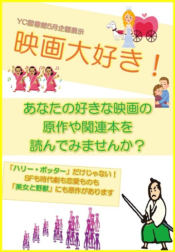 一覧へ 【終了しました】YC企画展示第2弾「映画大好き!」開催中 投稿日時: 2017/05/16 横浜 館内AVブースで映画を楽しんだ後は、関連した本を読んでみませんか? 原作本・英語多読テキスト・映画の世界観をもっと知るための本を展示中です。 ※横浜キャンパス図書館のWeb本棚