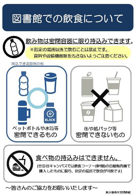 図書館では、ペットボトル・水筒等の密閉容器の飲料に限り、持込みができます。 (※飲用は、各図書館指定の場所をご確認ください。) 資料・設備機器類を汚さないよう、注意してください。 また、食べ物の持込みはできません。 快適な空間作りのため、ご協力をお願い致します。 詳細はポスターをご確認ください。