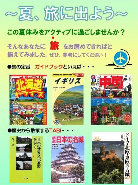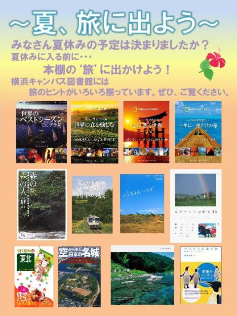 一覧へ 【終了しました】夏、旅に出よう ~旅のガイドブック充実~ 投稿日時: 2011/07/19 管理者 3キャンパス図書館には、様々な旅の本が揃っています。歴史・文化に触れる旅、食を楽しむ旅、エコ、路地裏、壮大な自然・・・旅のテーマは多種多様です。実際に訪れるのもよし、ページをめくって旅の気分を味わうのもよし、旅を通じて世界を開くと、新しい発見や出会いが待っています。この夏、図書館で、旅のヒントを見つけてみませんか?※写真は各キャンパスで作成したポスターです。クリックすると拡大します。