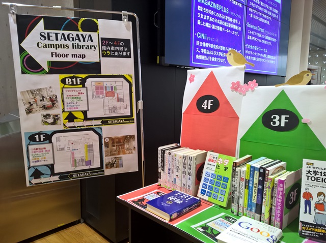 世田谷キャンパス図書館では、図書館各階の本を一同に集めた展示。