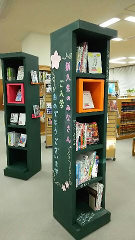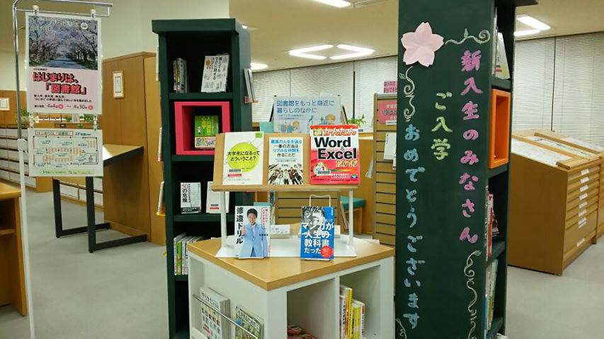 等々力キャンパス図書館では、新しい生活のスタートに役立ちそうな本を展示。